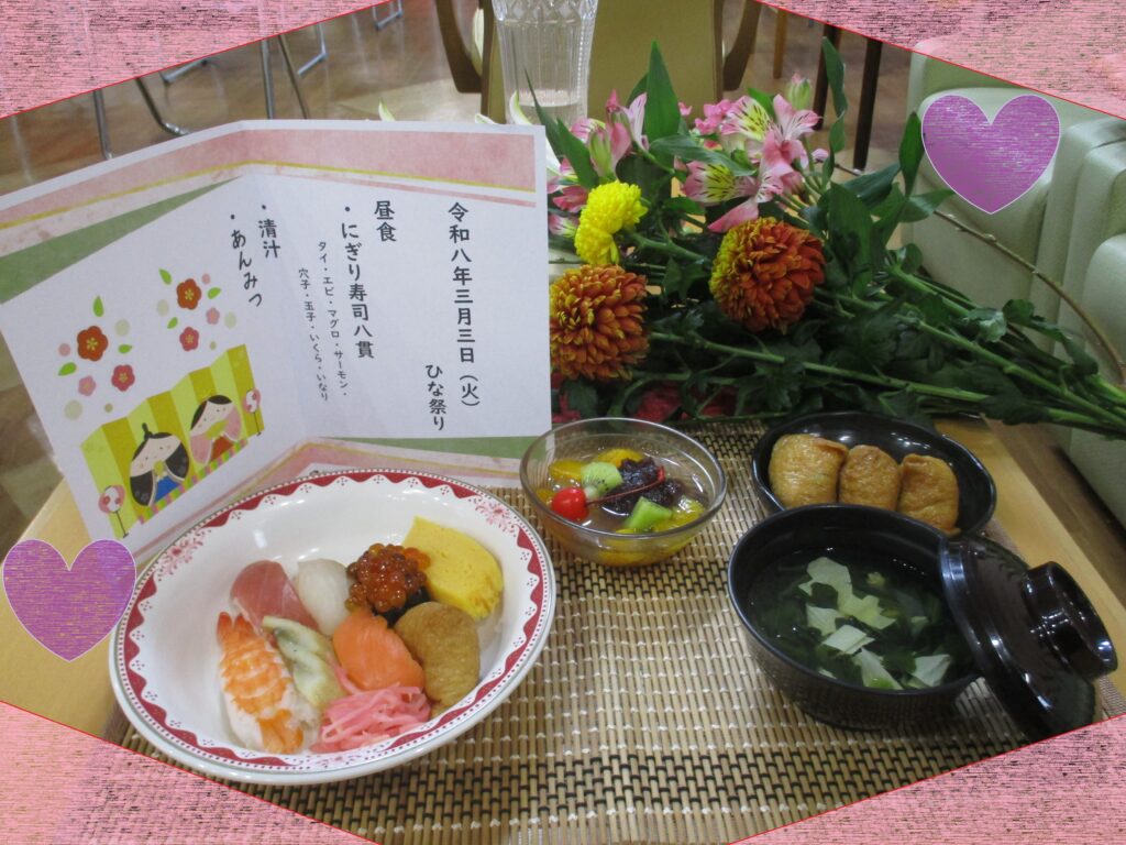 本日の昼食です♬にぎり寿司・清汁・あんみつとひな祭りメニューでした(>_<)ご利用者の皆さまから「にぎり寿司なんて滅多に出ないから嬉しいわ~、今日の昼食楽しみにしてたんよ!」などのお声を頂いております☆★昼食後、皆さまから「次いつ出るんかな?毎月でも食べたいわ~」とご好評を頂いております!